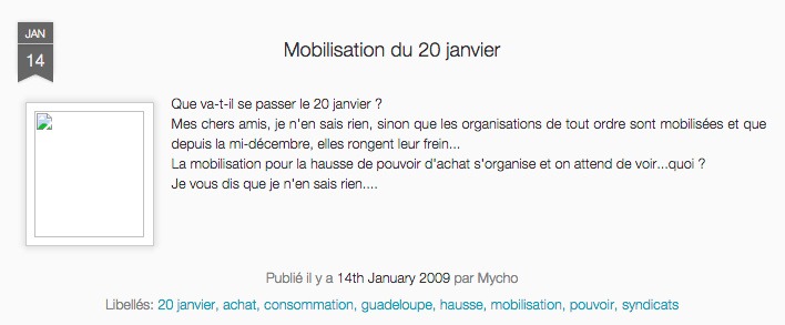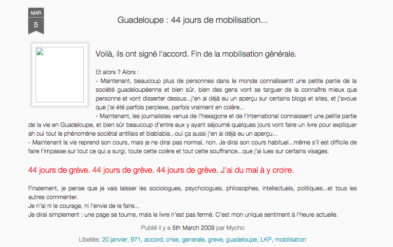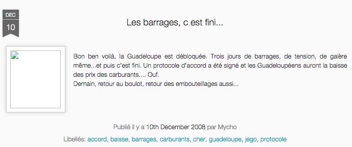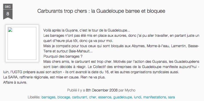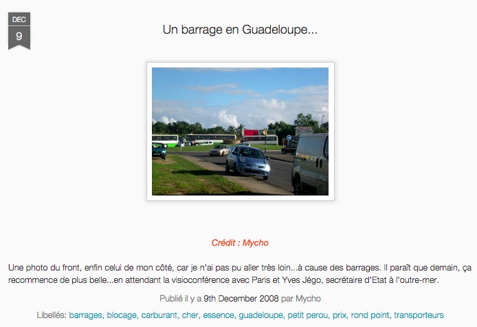 J’ai parlé (un peu) des barrages de fin 2008 et de la mobilisation du Liyannaj Kont Pwofitasyon (LKP) début 2009.