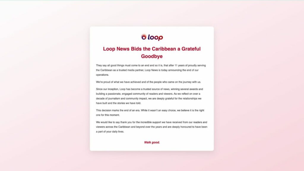 Après 11 années d’existence, Loop News a fermé ses portes. Sur son site, désormais, un message d’adieu clair et sobre : « They say all good things must come to an end… After 11 years of proudly serving the Caribbean as a trusted media partner, Loop News is today announcing the end of our operations. Walk good. »