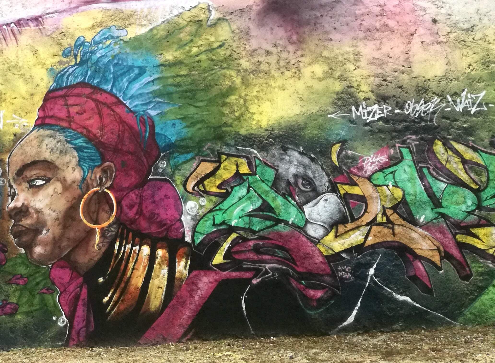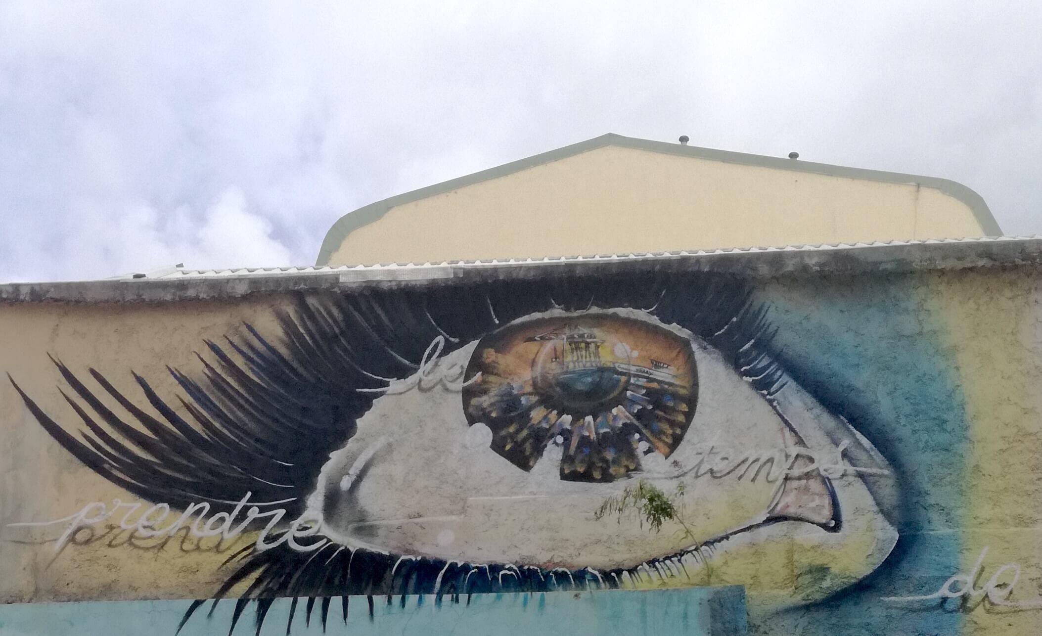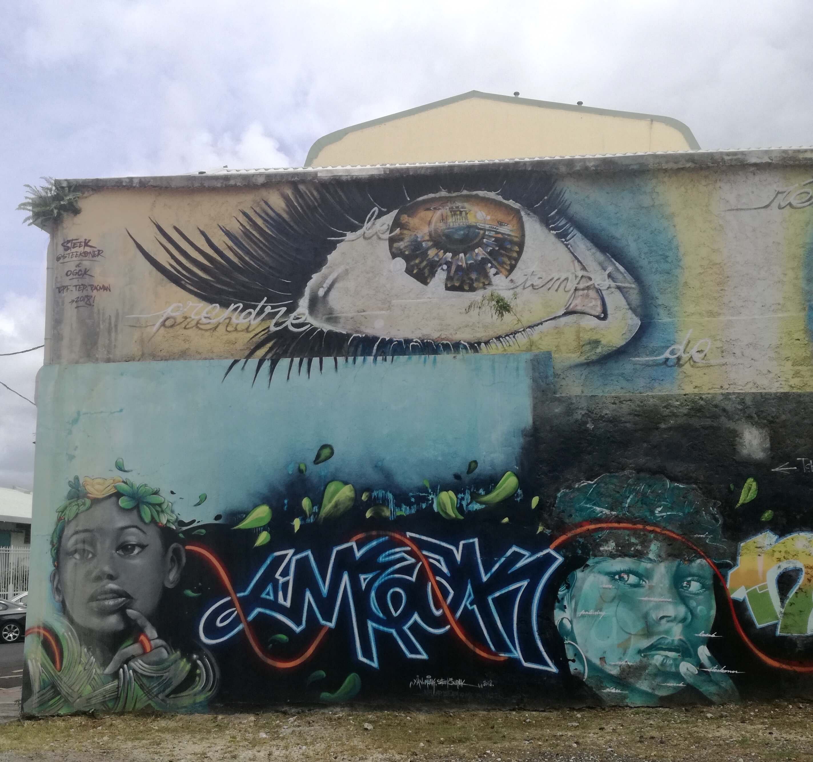 L’une des fresques qui m’interpellent le plus est sur un gigantesque mur à Pointe-à-Pitre, non loin du Port de Guadeloupe et du terminal de croisière. Elle a été créée par plusieurs artistes de street art.