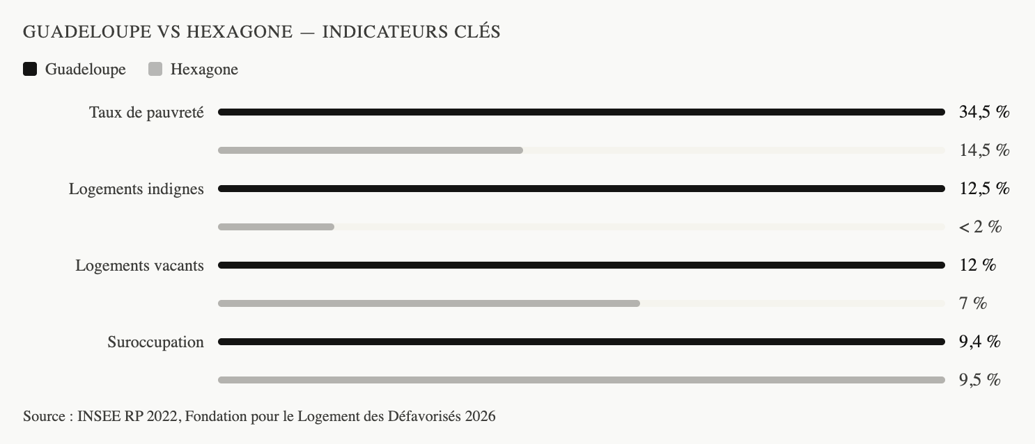 - 34,5 % : taux de pauvreté en Guadeloupe — contre 14,5 % en Hexagone