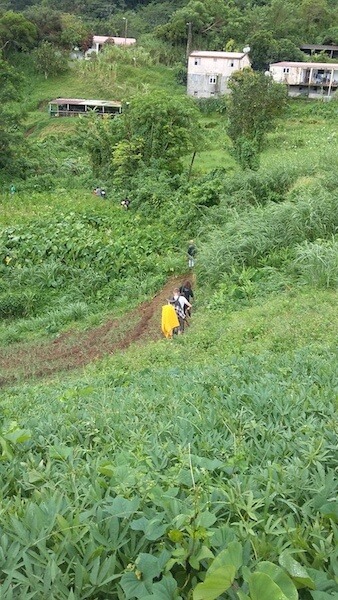 Nous avons donc tous pris la direction du champs à labourer, situé à quelques minutes à pied en contrebas. Quasi à mi-chemin, petite pause près de l’abri pour nous rafraîchir d’un bon jus local et écouter les explications de Pascale. Celle-ci nous a raconté qu’après l’abolition de l’esclavage, les noirs avaient des terrains mais pas d’outils pour les labourer. Les agriculteurs du Nord Caraïbe ont décidé de se regrouper pour notamment travailler la terre, mais aussi grager le manioc, en faire de la farine, ensemble.
